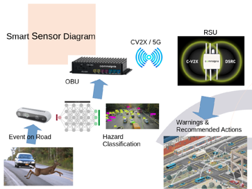 • Hazards and vehicle information is communicated in real time other road agents using ETSI standard V2X protocol (CAM/DENM).